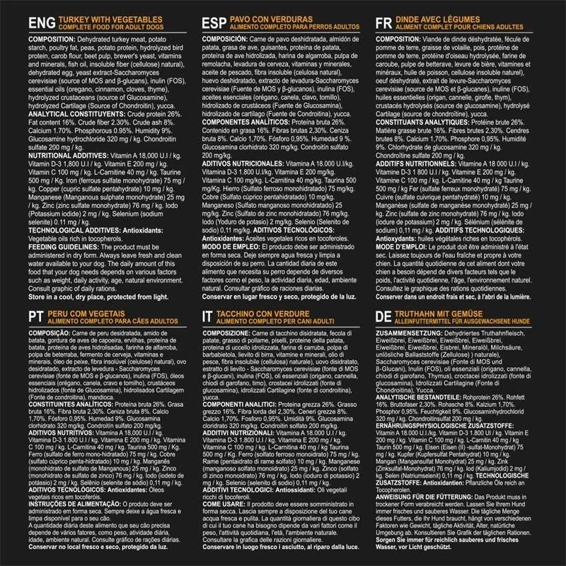 Getreide- und glutenfreies Futter für ausgewachsene Hunde auf Basis von Pute mit Gemüse. Reich an Proteinen und wenig Kohlenhydraten. Hypoallergen und monoproteinhaltig. Mit natürlichen Zutaten und ohne Konservierungsstoffe. Ideal für die Gesundheit von Knochen und Gelenken.