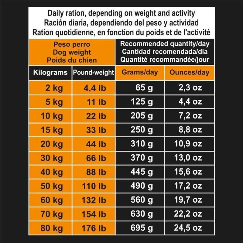 ANWENDUNGSHINWEISE: Die Formel sollte in trockener Form verabreicht werden. Stellen Sie immer frisches und sauberes Wasser für Ihren Hund bereit. Die tägliche Menge dieses Futters, die Ihr Hund benötigt, hängt von verschiedenen Faktoren wie Gewicht, tägliche Aktivität, Alter und Umgebung ab. Beachten Sie die auf dem Beutel aufgedruckte Tabelle mit den Tagesrationen. Kühl und trocken lagern, vor Licht schützen.