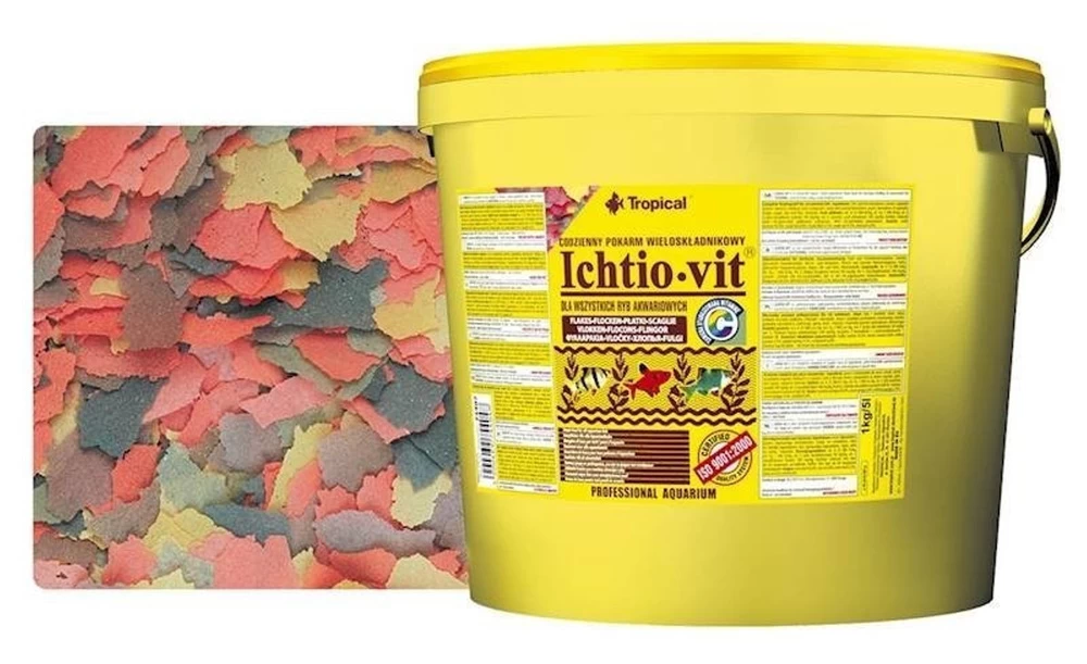 Ichtio-vit ist ein zutatenreiches Haupt-Alleinfutter in Flockenform für die tägliche Fütterung aller Zierfische. FÜTTERUNG: mehrmals täglich kleine Mengen. Alleinfuttermittel für Zierfische. Zusammensetzung: Fisch und Fischnebenerzeugnisse, Getreide, pflanzliche Eiweißextrakte, Weich- und Krebstiere, Fleisch und tierische Nebenerzeugnisse, pflanzliche Nebenerzeugnisse, Algen, Hefen, Öle und Fette, Mineralstoffe. Zusatzstoffe: Vitamine, Provitamine und chemisch definierte Stoffe mit ähnlicher Wirkung: Vit. A 23 000 IE/kg, Vit. D3 1 400 IE/kg, Vit. E 90 mg/kg, Vit. C 340 mg/kg. Verbindungen von Spurenelementen: E1 Eisen 27,1 mg/kg, E6 Zink 7,4 mg/kg, E5 Mangan 5,6 mg/kg, E4 Kupfer 1,33 mg/kg, E2 Jod 0,16 mg/kg, E8 Selen 0,16 mg/kg, E7 Molybdän 0,037 mg/kg, E3 Cobalt 0,009 mg/kg. Lecithin. Farbstoffe. Antioxidationsmittel. Analytische Bestandteile: Rohprotein 45,0%, Rohöle und -fette 6,0%, Rohfaser 2,5%, Feuchtigkeit 6,0%.