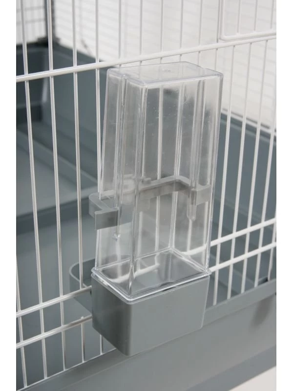 Die 5 Löcher ermöglichen es Ihnen, die Vögel in aller Sicherheit herauszuziehen. Außerdem hat er 3 innere Sitzstangen, 1 äußere Sitzstange zum Aufsetzen auf das Öffnungsgitter oben im Käfig, 2 Tröge und 4 Füße zum Anheben des Käfigs.
